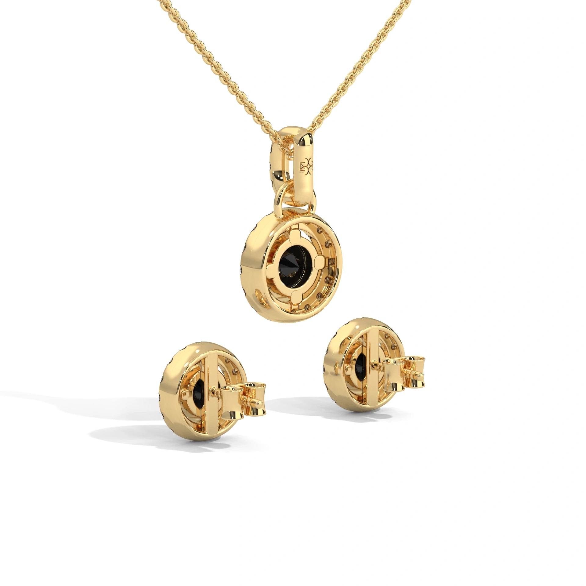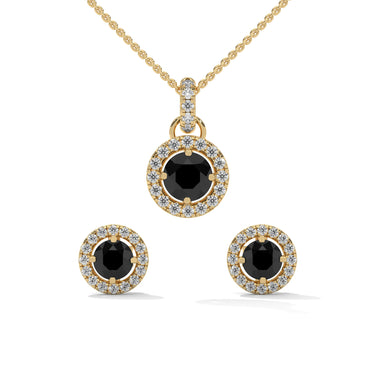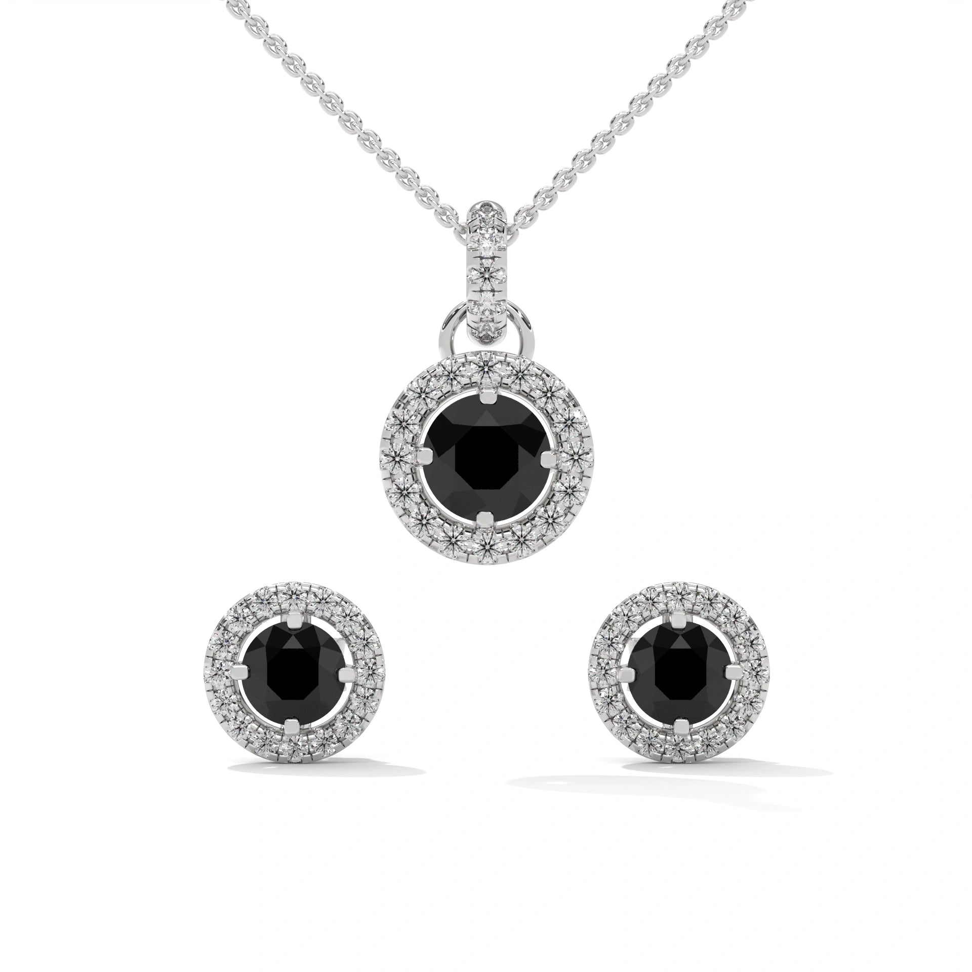 Black Diamond Halo Pendant & Stud Earrings Set in White Gold