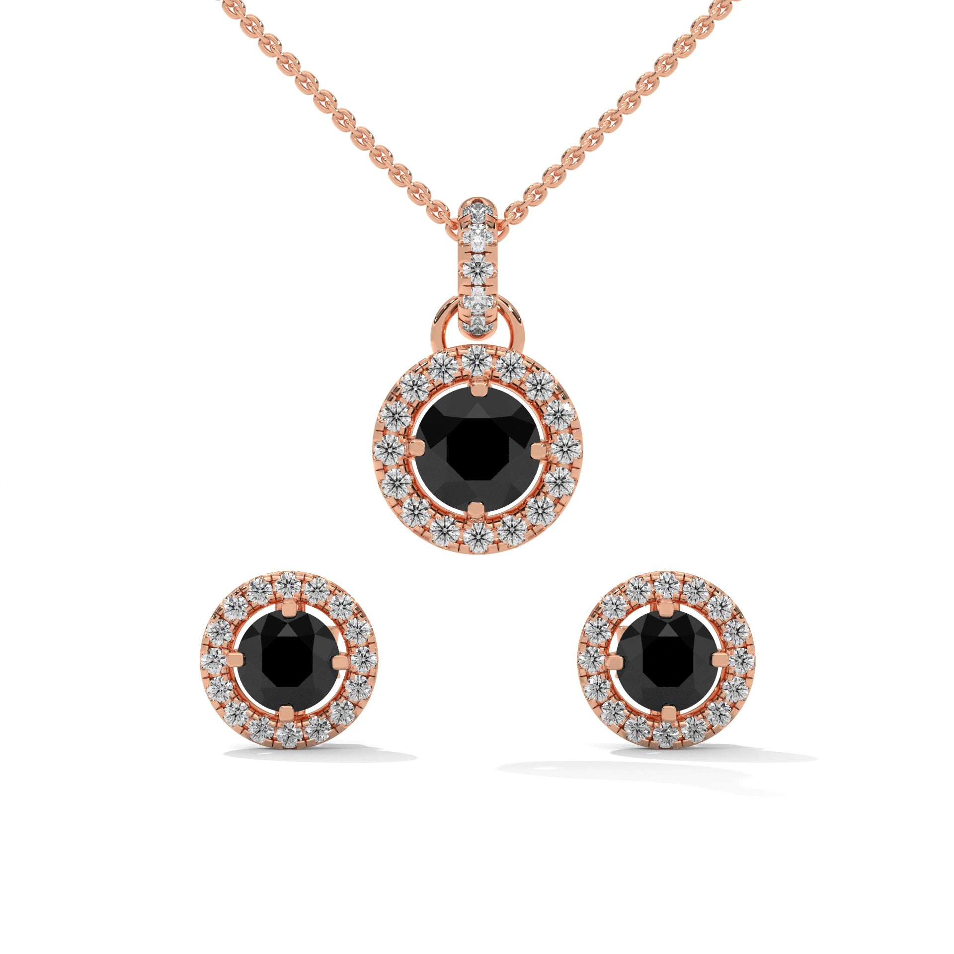 This Exquisite 1.83 Ct Black Diamond Pendant With Matching Diamond Stud Earrings Has An Understated Style Due To The Unique Design, Including The White Diamond Halo Surround, Which Is Set In Rose Gold. The Modern Look Of The Lab-Created Diamond Pendant And Black Diamond Earrings Will Enhance Your Daily Wardrobe Or Special Occasions By Adding A Dramatic Presence To Your Style Of Dress. The Captivating Depth Of The Natural Black Diamonds Combined With The Bright Sparkle Created By The White Diamond Accents Brightens Every Occasion And Provides A Great Gift Idea For Birthdays, Anniversaries, And All Milestones!